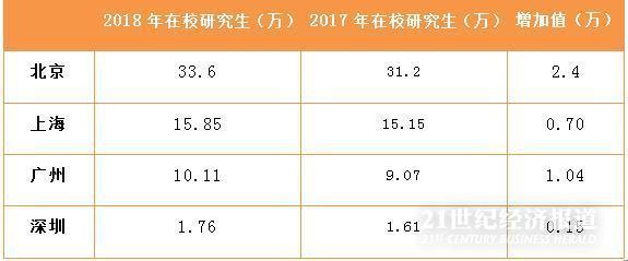 研究生往往更能代表城市高水平大学的情况,尤其是在前沿科技竞争时代,高水平大学的研究生是科研、产业人才的重要储备力量。对比前述表格可知,北京、上海的本专科生在校生数量相比广州并不占优势,但研究生数量却出现了明显的“逆袭”,尤其北京的在校研究生数量大幅领先,这也恰对应着其雄厚的高教科研实力。在这一项指标中,深圳的短板更加突出。