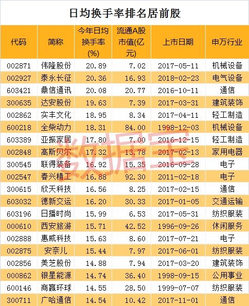 泰永长征、鼎信通讯今年以来换手率分别为20.36%、20.08%,这两只个股上市日期分别在2018年、2016年,流通A股市值分别为16.93亿元、20.77亿元。除上述3股外,换手率较高的还有达安股份、实丰文化、全柴动力、亚振家居、高斯贝尔等。