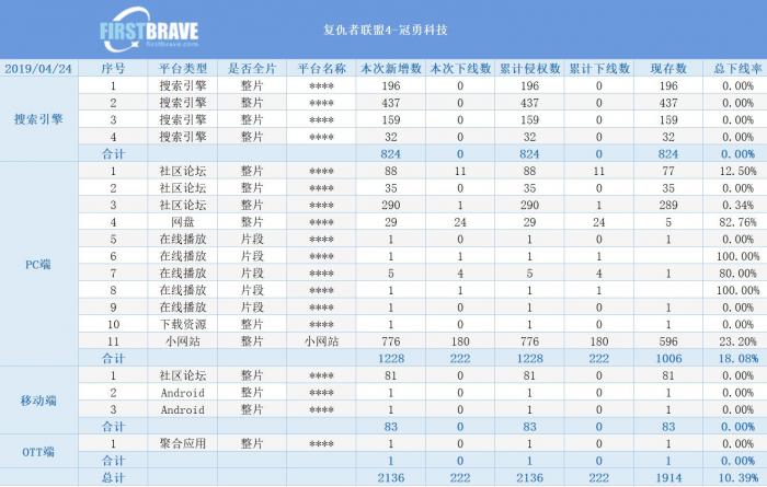 冠勇科技创始人兼CEO吴冠勇4月24日向21世纪经济报道记者介绍,据冠勇科技FB版权大数据平台的主动监测数据显示,截止时间4月24日18点,《复联4》目前出现侵权链接总数2136条,上映首日侵权总量较《复仇者联盟3》的盗版链接多出一倍,甚至比掀起舆论热议的2019年春节档重点院线影片的盗版链接也多出一倍。