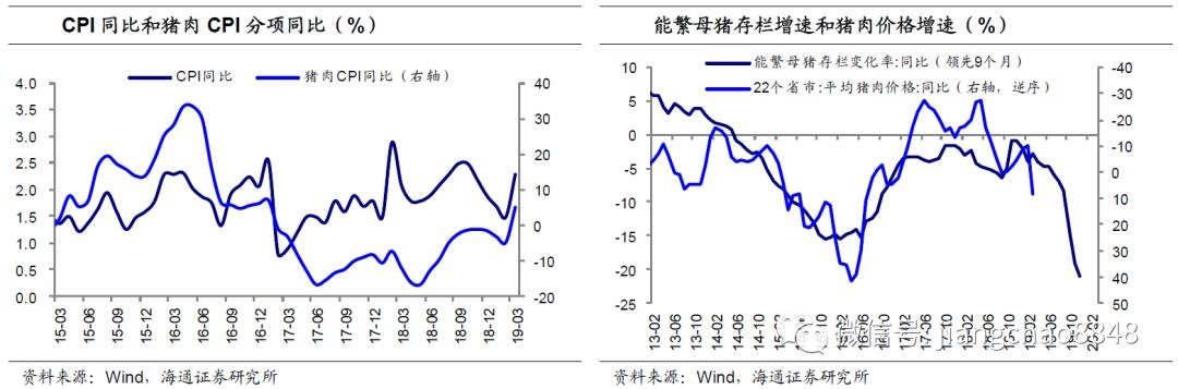 一方面,猪价上行带动CPI增速。随着非洲猪瘟助推猪价上行周期启动,3月CPI猪肉分项同比从2月的-4.8%上升至5.1%,3月CPI同比则从2月的1.5%大幅回升到2.3%。而当前生猪存栏和能繁母猪存栏仍在下滑,3月同比跌幅均已扩大至-20%左右,这预示着在今年接下来的时间里,猪价将进一步上行,继续拉高CPI水平。