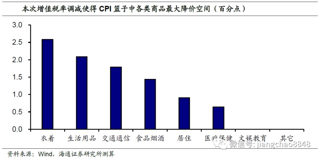 其次,本轮减税对CPI中的不同分项价格的具体影响程度也不同。我们根据其内部权重进行加权平均,可以得到该大类的价格调降幅度。我们估算,本次增值税率调减使得CPI篮子中理论降价空间最大的分项是衣着类商品,因为该类商品原税率多为16%,理论上价格最大可降约2.6%,而部分服务类项目无降价空间,各大类分项的价格理论最大降幅中位数约1.2个百分点。