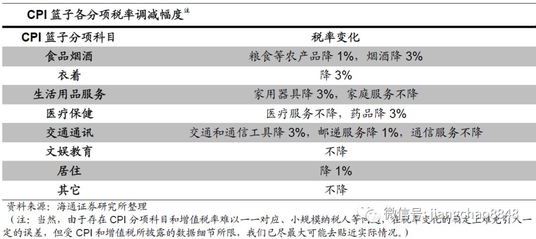 其次,本轮减税对CPI中的不同分项价格的具体影响程度也不同。增值税缴纳是基于销售商品和服务的品类,因此我们可以据此确定每类商品在本轮减税中的税率变化,从而得出理论上其价格的最大降幅。根据本次税率调整方案来看,多数商品的税率由16%调整至13%,如衣着、家电等,而由10%税率降至9%的则主要是农产品和不动产租赁等部分服务业,其它服务业则维持6%税率不变。对应到CPI的构成中,文娱教育、其它等和服务类相关的科目税率几乎未做调整,而像衣着、生活用品等商品类相关科目调整幅度较大。