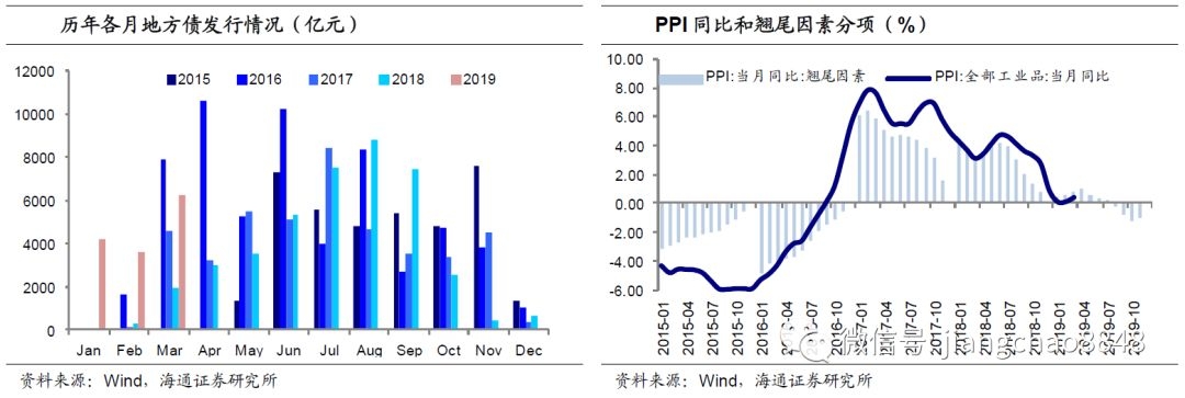 同比增速大幅反弹至8.5%,也对生产资料价格起到支撑。但往后看,PPI的回升可能难以持续,下半年仍有压力。PPI往往与地产投资联系在一起。在16年供给收缩大幅推升上游生产资料价格之前,PPI走势几乎与地产投资一致。往后看,一方面,本轮经济政策并未对地产领域采取刺激手段,地产销售偏弱不支持地产投资的持续回升。另一方面,但仅靠基建拉动PPI的效果比较有限,且今年财政投放加快、支出前移,却并没有大幅增加资金总量,这意味着后续投资端或仍面临下行压力,基建对价格的拉动也难持续。考虑到5月份以后翘尾因素开始大幅回落、到8月转负,如果新涨价因素不强的话,下半年PPI同比仍有转负的压力。