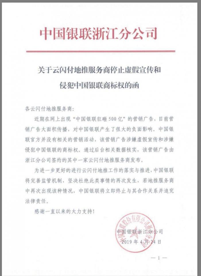 21世纪经济报道记者获悉,4月24日,银联浙江分公司向其云闪付地推服务商下发一份《关于云闪付地推服务商停止虚假宣传和侵犯中国银联商标权的函》。