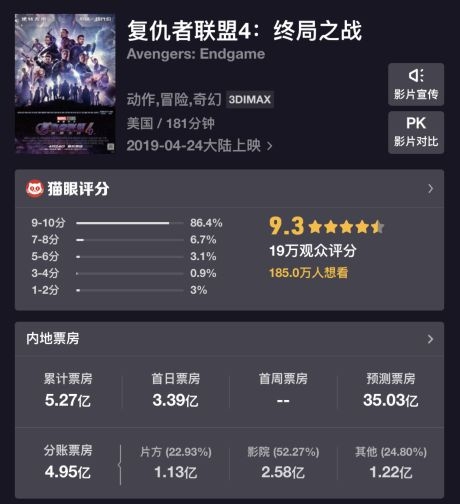 截至发稿,《复联4》上映首日票房已达到3.39亿元,累计票房5.27亿元。从分账票房(4.95亿元)来看,片方收获1.13亿元,影院方也已分得2.58亿元。