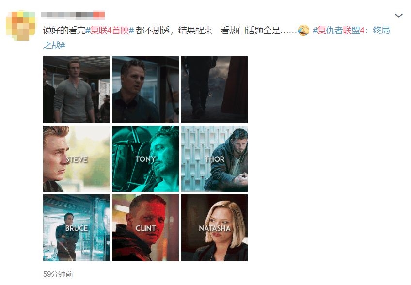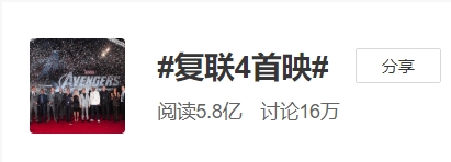 截至今日上午,仅仅“复仇者联盟4:终局之战”、“复联4首映”两个话题,就斩获超过30亿次阅读和250多万条评论——这还不算其他各种涉及剧透的分支话题。
