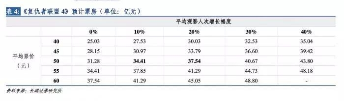 “考虑中性假设情形,即在《复仇者联盟 3》平均观影人次为6257万的条件下且观影人次 增长幅度为10%-20%,全国平均票价为50元时,《复联4》的预计票房为35亿左右。”