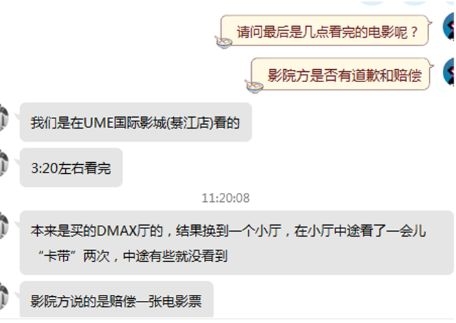 重庆影迷周先生也向记者爆料,他凌晨在UME国际影城(綦江店)观影时,也被接连不断的事故“影响了心情”。“本来是买的DMAX(巨幕厅)的,结果换到一个小厅,在小厅中途看了一会儿‘卡带’两次,就有些(画面)就没看到。”原本零点开始的电影,最终看完已经到半夜3时20分了。对此,该影院的解决方式是,赔偿观众一张电影票。
