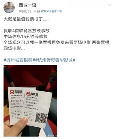 对此,影院也进行了赔偿:凭一张票根可以再免费来看两场电影。有网友晒票根并感叹,“大概是最值钱的票根了”。