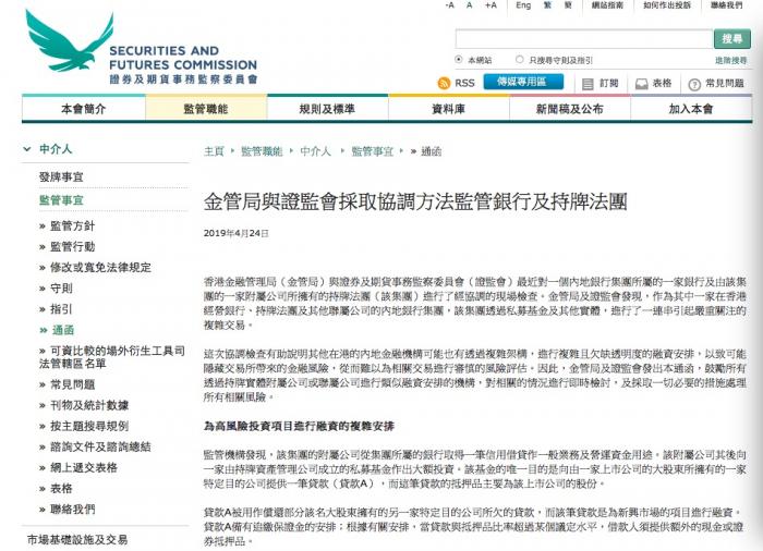 4月24日,香港证券及期货事务监察委员会官网显示,香港金融管理局及证监会对一家内地银行集团旗下进行的复杂交易进行调查,发现隐匿涉及上市公司股权质押的金融风险,运用的是通过私募机构把保证金融资变成了投资的手法。