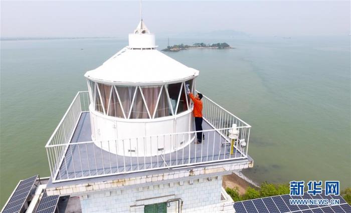 黄灿明在维护灯塔设施(4月3日无人机拍摄)。 新华社记者 邓华 摄