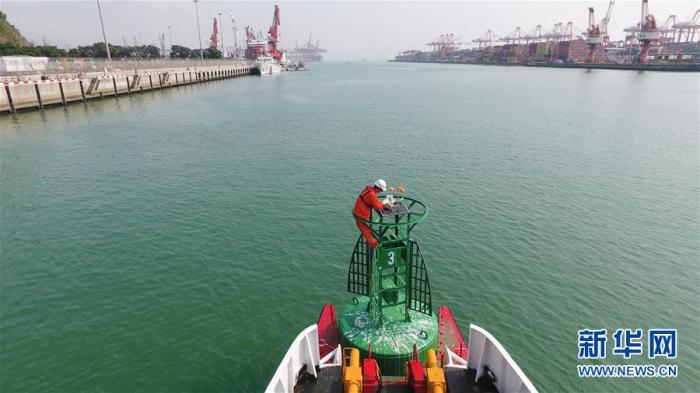 黄灿明的儿子黄登科在深圳赤湾港港池保养维护航标(4月17日无人机拍摄)。新华社记者邓华摄