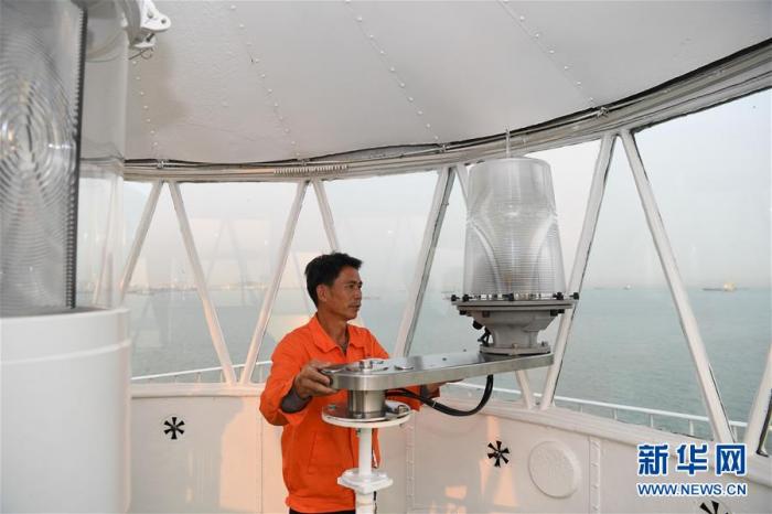 黄灿明在检查灯塔辅灯设备(4月2日摄)。新华社记者邓华摄