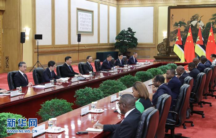习近平指出,欢迎总统先生来华出席第二届“一带一路”国际合作高峰论坛。在本届论坛上,各国领导人将本着共商共建共享原则,讨论发展政策对接、基础设施互联互通、可持续发展等共同关心的议题,为促进世界经济增长、推动国际经济合作作出更大贡献。莫桑比克是古代海上丝绸之路的重要一站,近年来积极参与共建“一带一路”。双方已经就共同推进“一带一路”合作规划达成一致,要致力于推动互利合作提质增效,加强人文交流合作,让中莫“同志加兄弟”的传统友谊不断得到继承和发扬。