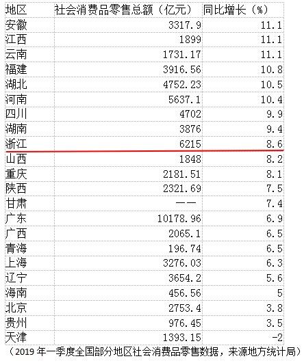 其中,贵州和天津的增速仅有3.5%和-2%。贵州省较2018年同期的增速大幅回落8.9个百分点。而天津-2%的增速,则为2000年以来的首次季度数据负增长。