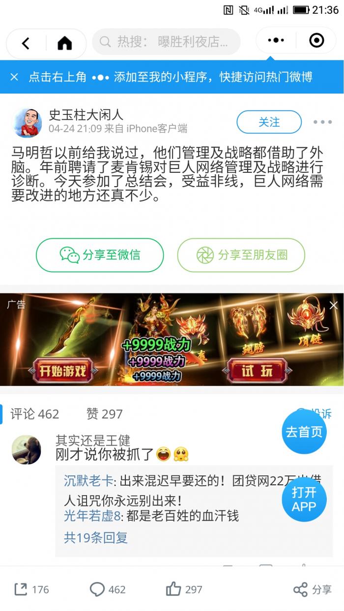 24日21:09,史玉柱本人的名为“史玉柱大闲人”的微博发出发出一条微博称,“马明哲以前给我说过,他们管理及战略都借助了外脑。年前聘请了麦肯锡对巨人网络管理及战略进行诊断。今天参加了总结会,受益非线,巨人网络需要改进的地方还真不少。”