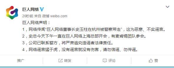 巨人网络发声明公开辟谣,称公司已报警,史玉柱根本没去杭州,下午还在上海总部开会