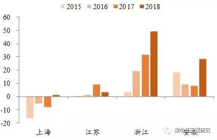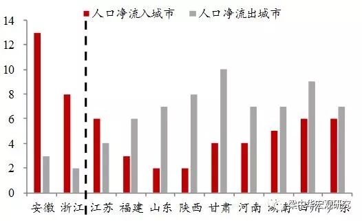 长三角城市群整体仍在大幅净流入,但内部格局也在分化。浙江人口流入继续领跑,安徽成最大“黑马”。而反观上海和江苏两地,上海由于控制人口总量,15-17年人口持续外流,尽管18年人口呈现净流入,但规模也仅有1万人;而江苏的人口净流入规模近几年一直不大,而且已经连续6年人口净流入量少于安徽。前些年安徽人口主要流向了上海、江苏和浙江,而现在安徽人口出现回流迹象,这三大流入地可能会受到一定影响。