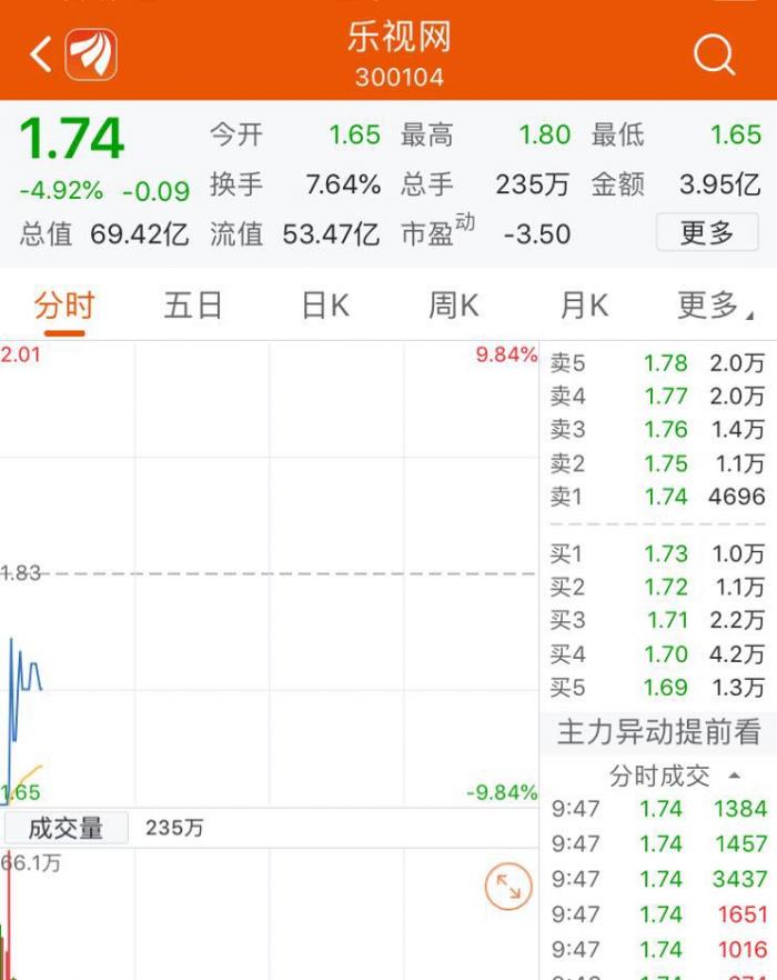 4月25日早盘,乐视网打开跌停,随后跌幅有所缩小,目前跌4.92%。此前已连续三个交易日跌停,截至目前股价为1.74元/股,总市值约69亿元。