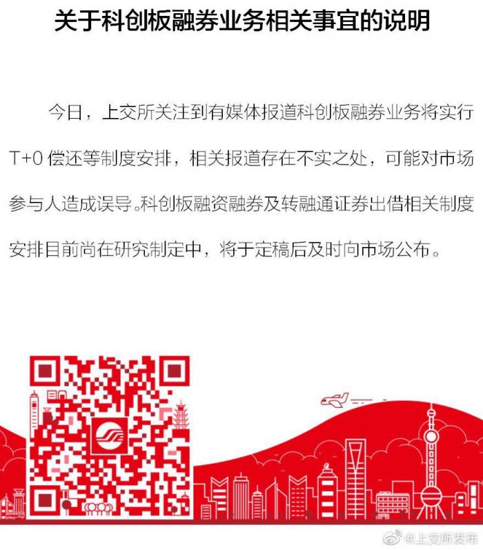 4月25日上午,上交所在其官方微博中表示,已关注到有媒体报道科创板融券业务将实行T+0偿还等制度安排,相关报道存在不实之处,可能对市场参与人造成误导。