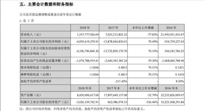 财务数据显示,2018年乐视网营业收入15.58亿元,归属于母公司股东的净利润亏损40.96亿元,对应归属于母公司股东的净资产也定格在-30.26亿元。