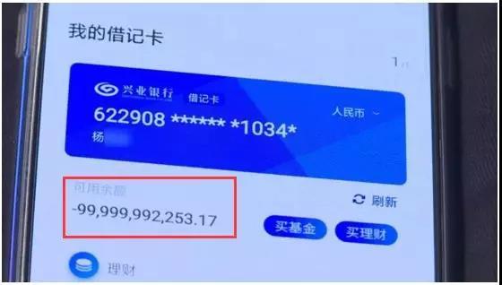 第一个月发工资时,杨先生发现工资取不出来,以为是银行卡没激活。可是到了4月份的时候,工资仍然用不了。于是,杨先生下载了兴业银行的APP查询,余额显示:-99,999,992,253.17 (负999亿余元)。