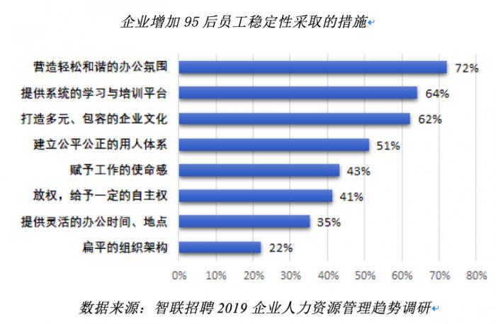 但在针对企业如何增加95后员工稳定性调查中,薪酬因素并未进入主要措施,最重要的措施恰恰是营造轻松和谐的办公氛围、提供系统性的学习与培训平台成为最重要的两项因素。