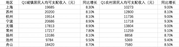 而从具体城市角度来看,截止目前,长三角地区共有9个地区发布了今年第一季度的收入情况。