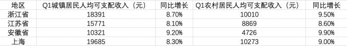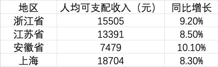 同时,浙江和江苏两省的人均可支配收入数额紧跟其后,位列全国第三、第四。尽管安徽省全体居民人均可支配收入低于全国平均水平1000余元,但呈现出中、东部地区最高增速,同比增幅达10.1%。