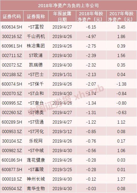 在非创业板公司中,*ST保千、*ST众和、*ST皇台、*ST德奥已连续两年净资产为负,根据交易所规则,可能被暂停上市。 *ST保千4月26日公告称,因公司2017年、2018年连续两年净资产为负,2017年、2018年连续两年的财务报告被会计师事务所出具了无法表示意见的审计报告,公司股票将自4月26日起连续停牌。上交所将在公司股票停牌后的十五个交易日内做出是否暂停公司股票上市的决定。 *ST皇台4月26日公告称,公司因连续亏损三年且最近两个会计年度期末净资产为负,公司股票将自4月26日开市起停牌,深交所将自公司股票停牌后15个交易日内作出是否暂停公司股票上市交易的决定。*ST皇台2018年度亏损9548.15万元。 *ST德奥4月27日公告称,公司2017、2018年度连续两年经审计的净资产为负,公司股票将于年度报告披露后次一交易日即2019年4月29日开市起停牌,深交所将在停牌后15个交易日内作出是否暂停公司股票上市的决定。 *ST众和1月8日晚间公告称,公司预计2018 年年度经营业绩亏损、公司期末净资产为负值,公司股票可能被终止上市。深交所将在公司披露年度报告之日后的十五个交易日内,作出是否终止公司股票上市的决定。