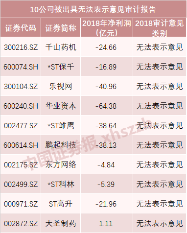 根据交易所规则,上市公司最近一个会计年度的财务会计报告被会计师事务所出具否定意见或者无法表示意见的,对其股票实施退市风险警示; 上市公司的股票因前述事项被实施退市风险警示后,公司最近一个会计年度的财务会计报告被会计师事务所出具否定意见或者无法表示意见的,其股票应暂停上市; 上市公司的股票因前述事项被暂停上市后,公司最近一个会计年度的财务会计报告被会计师事务所出具否定意见、无法表示意见或者保留意见的,其股票应终止上市。 2018年年报被出具无法表示意见的上市公司共有10家,分别是千山药机、*ST保千、乐视网、华业资本、*ST雏鹰、鹏起科技、东方网络、*ST科林、ST高升、天圣制药,其中*ST保千、千山药机已连续2年被出具无法表示意见的审计报告。