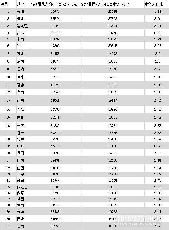 而城乡收入差距最小的地区分别为天津、浙江、黑龙江、吉林、上海和江苏。