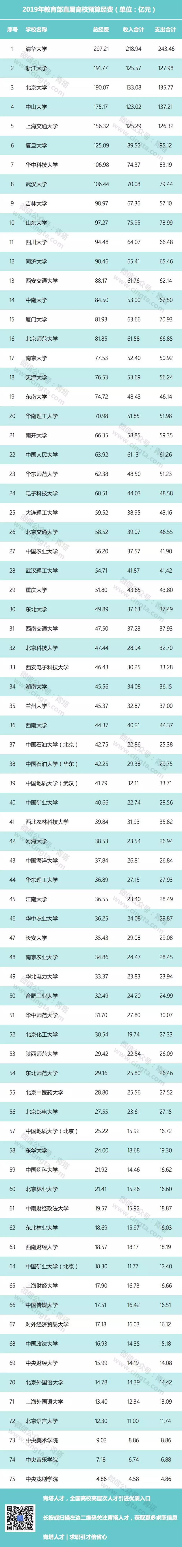 截至26日晚,全国75所教育部直属高校都在各自的信息公开网站上公布了2019年财务预算。根据整理的数据,共有8所高校预算总数过百亿。