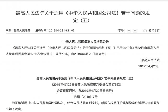 4月28日晚,最高人民法院发布了关于适用《中华人民共和国公司法》若干问题的规定(五),就股东权益保护等纠纷案件适用法律问题作出规定。