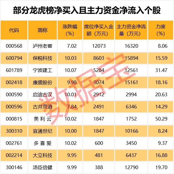 从盘口资金流向来看,主力资金净流入超千万且龙虎榜净买入个股共有11只,其中泸州老窖、保税科技、康盛股份等个股资金净流入金额最大。净流入力度最大的个股有美利云、宁波建工、启迪古汉,净流入力度分别为50.29%、31.47%、20.63%。