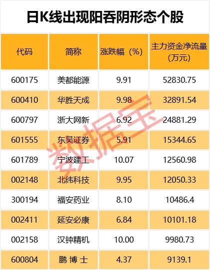 截至4月26日收盘,两市共有65只个股日K线出现阳吞阴形态,宁波建工、龙蟠科技、依米康等均以涨停收盘。