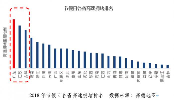 其中,高速拥堵排名前三的省份是广东省、江苏省、安徽省,而吉林、黑龙江、宁夏高速相对畅通。