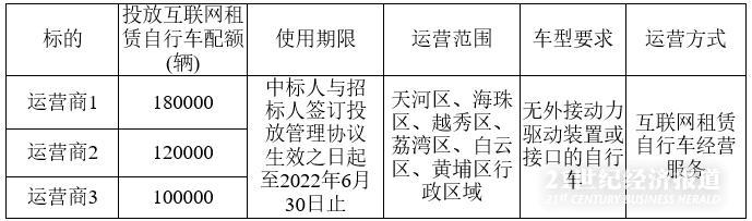 同时,明确运营范围为天河区、海珠区、越秀区、荔湾区、白云区和黄埔区行政区域,即为该市主城区,车型也要求是无外接动力驱动装置或接口的自行车。