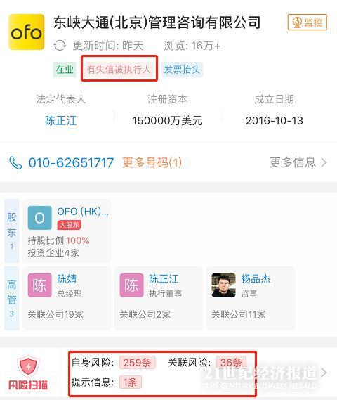 这将使诸多存在运营风险的共享单车企业被拒之门外。21世纪经济报道记者查询企查查发现,目前作为ofo运营主体的东峡大通(北京)管理咨询有限公司就存在多项失信风险,原因主要是“因未按时履行法律义务被法院强制执行”。