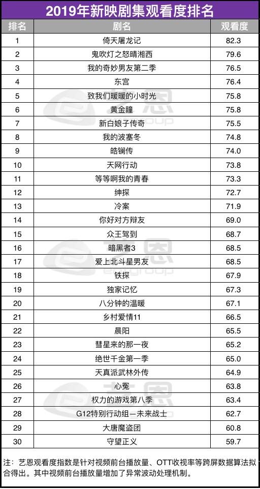 艺恩数据显示,在新映剧集观看度排名中,《倚天屠龙记》、《鬼吹灯之怒晴湘西》、《我的奇妙男友第二季》位列前三,《权力的游戏第八季》仅在27位。艺恩方面表示,观看度指数是针对视频前台播放量、OTT收视率等跨屏数据算法拟合得出。其中视频前台播放量增加了异常波动处理机制。腾讯视频数据显示,在电视剧热搜榜单上,《权力的游戏第八季》排名第4,在《如果可以这样爱》、《封神演义》、《都挺好》之后。