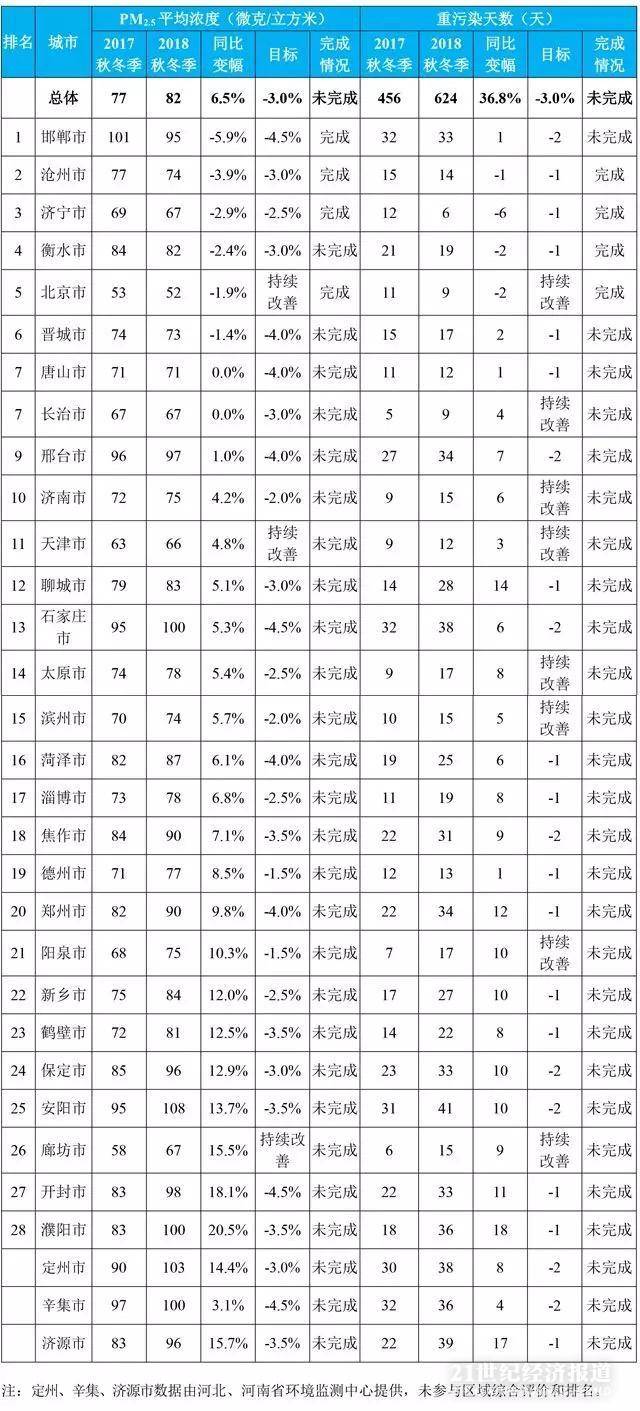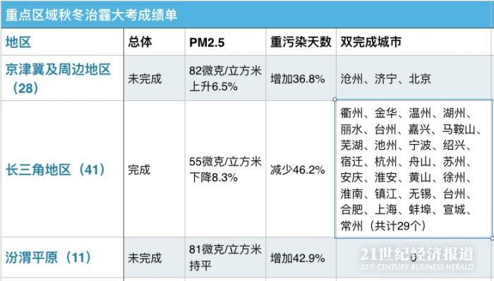 分区域来看,京津冀及周边地区“2+26”个城市中,仅北京、沧州、济宁完成了PM2.5浓度改善和重污染天数减少目标。
