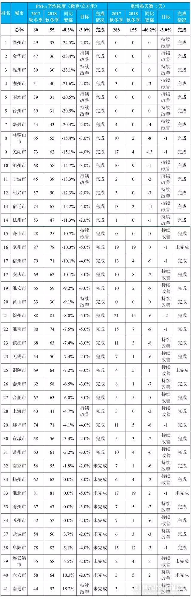 《长三角地区2018-2019年秋冬季大气污染综合治理攻坚行动方案》空气质量目标完成情况