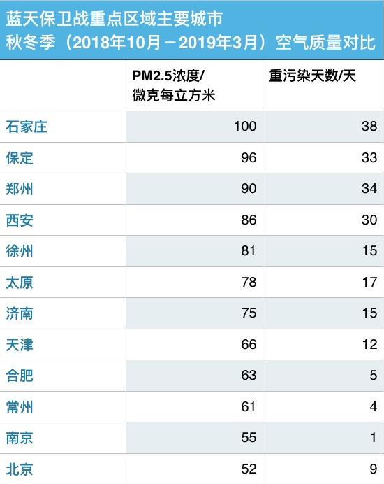 2018-2019年秋冬季,气象条件不如前两年,即使重点区域目标降幅缩小,京津冀及周边地区、长三角、汾渭平原80个城市中,只有北京、沧州、济宁、上海等32个城市完成了PM2.5浓度改善和重污染天数减少目标,完成率仅40%。