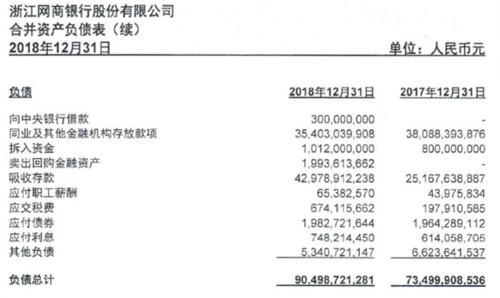 对于互联网银行,由于没有线下实体网点,其存款规模较小,较多依赖同业负债,一定程度上限制了其发展。因此,外界对于网商银行的负债结构十分关注。