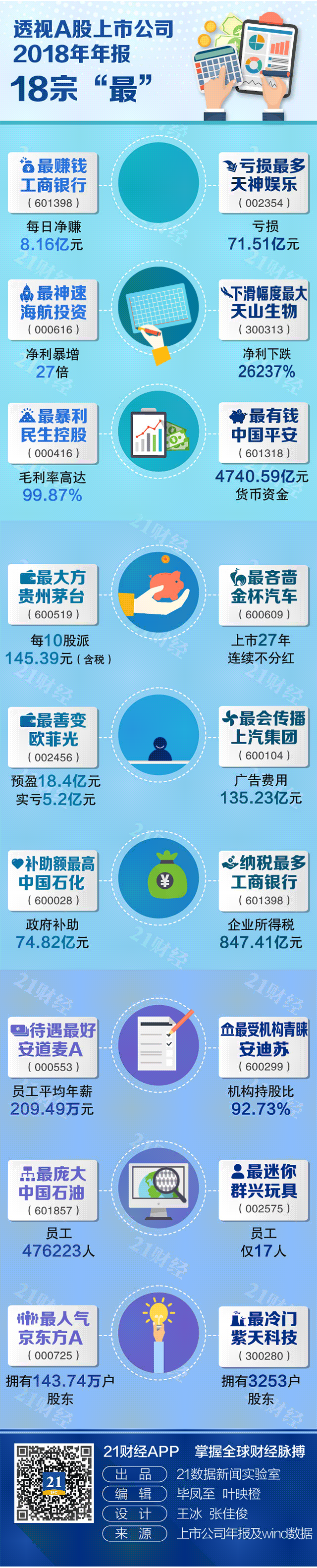 截至目前,3600多家A股上市公司2018年年报已基本披露完毕。哪些公司最赚钱/最亏钱/最暴利/最有钱/最大方/最吝啬……21数据新闻实验室盘点了上市公司2018年年报的18宗“最”,以飨广大股民。