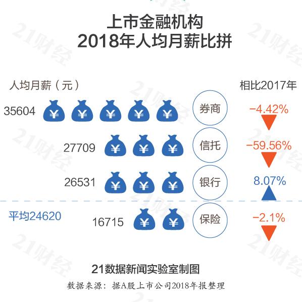 注:本文只计算A股上市的74家券商、银行、保险、信托公司,数据来自于上市公司2018年报。由于各公司有编制在外的员工,薪酬数据仅供参考,不一定代表真实情况。