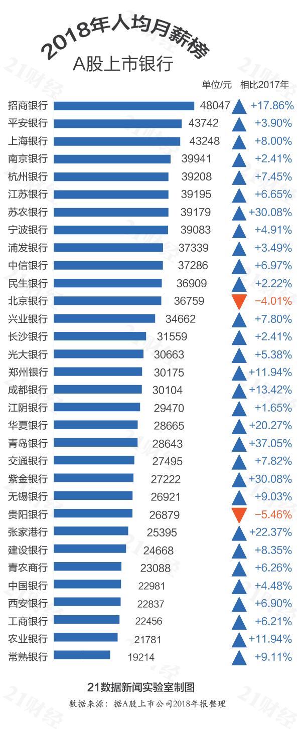 比如银行,虽然整体薪酬水平不及券商信托,但是近两年增幅一直居首。即使在2018年整体环境不那么乐观的情况下,32家A股上市银行中有30家人均薪酬出现上涨,9家涨幅超过10%,青岛银行(002948.SZ)、苏农银行(603323.SH)、紫金银行(601860.SH)涨幅均超过30%。当然,如果又高薪又涨薪那就更好啦,如招商银行(600036.SH),2018年人均月薪达48047元,同比增长17.86%。