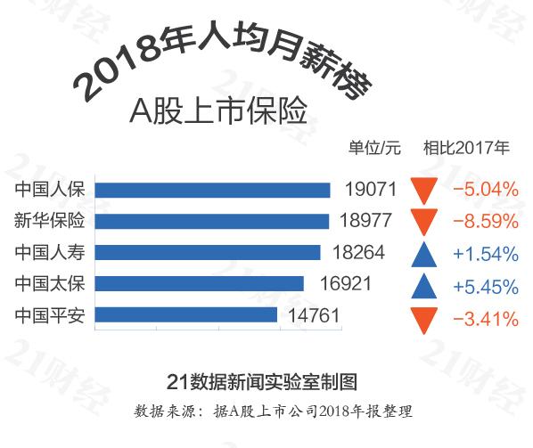 相比而言,保险公司则不那么吃香,5家上市险企人均月薪均未超过2万元,几乎处于垫底水平,新华保险(601336.SH)、中国平安(601318.SH)、中国人保(601319.SH)均有不同幅度的下滑。值得注意的是,新华保险近两年持续减员, 2017年减员1.33万人后2018年再减2502人,是唯一一家减员的上市险企。