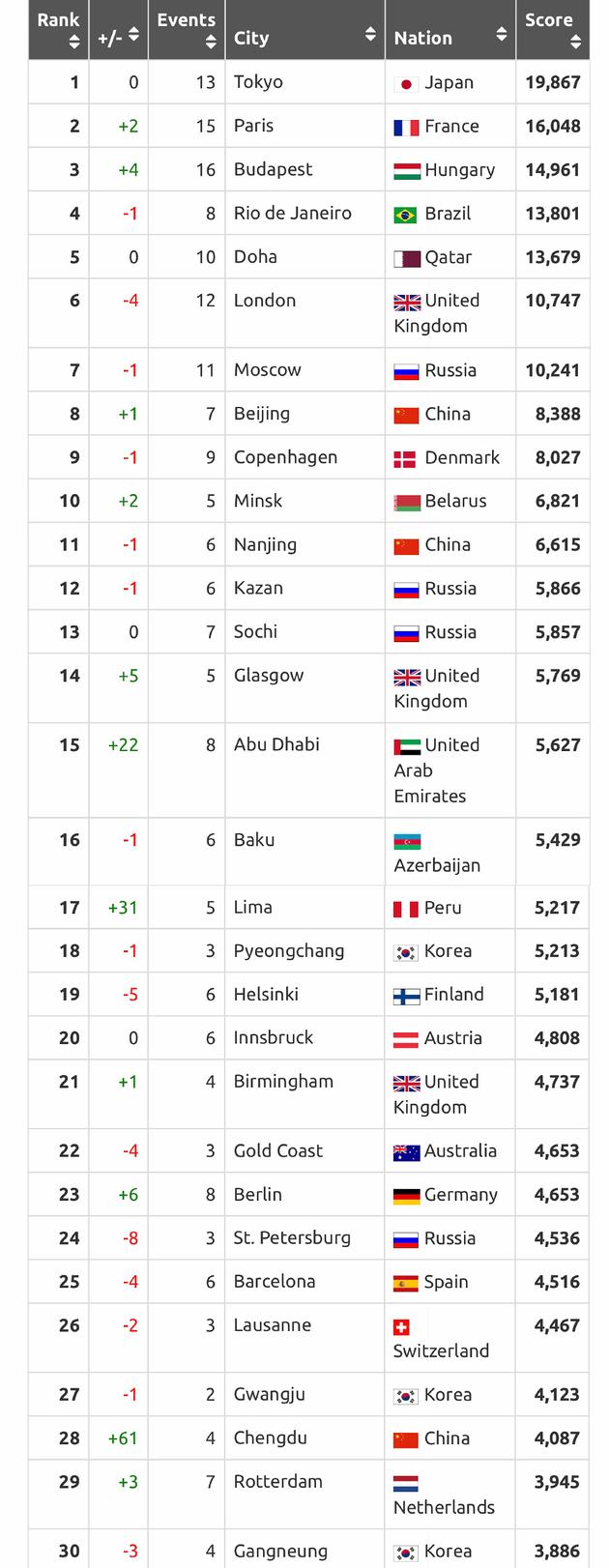 英国伦敦当地时间4月30日,体育市场情报服务商Sportcal发布了2019年的全球赛事影响力(GSI)的国家和城市榜单,中国打破了美国对于该榜单连续三年的垄断,升至第一名。而全球体育赛事前三十强中,亦首次有三座中国城市上榜,分别是北京市、南京市和成都市。