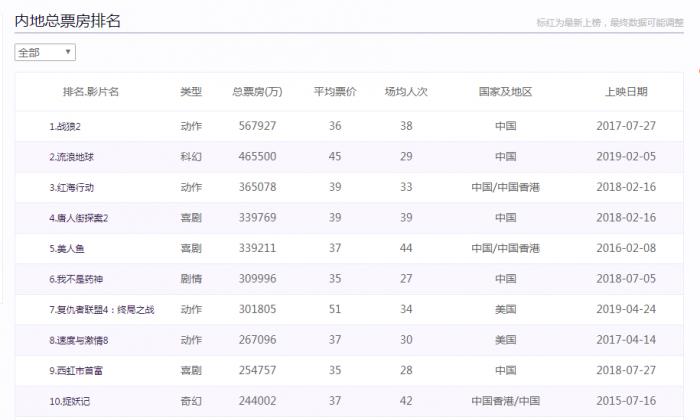 此前,共有6部国产影片冲破内地30亿票房,分别是: